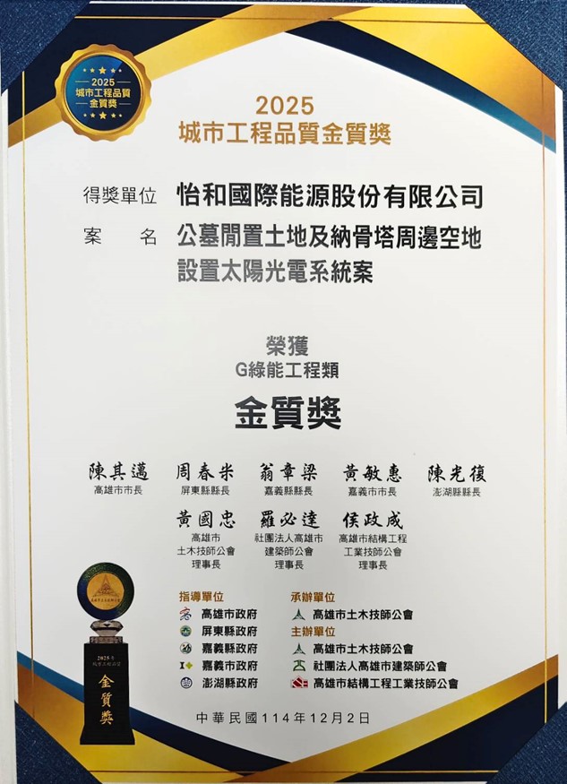 怡和繼2023年城市工程品質金質獎、2024年高雄市政府光電智慧建築標章認證金獎,
